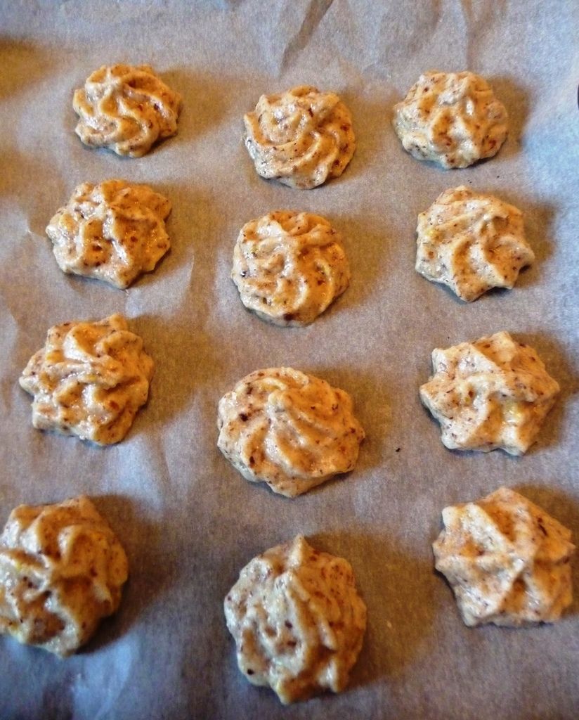 4) Sur une plaque recouverte de papier sulfurisé, former les macarons de la taille d'une noix comme vous le souhaitez avec une poche à douille ou 2 cuillères. Laisser assez d'espace entre les macarons.