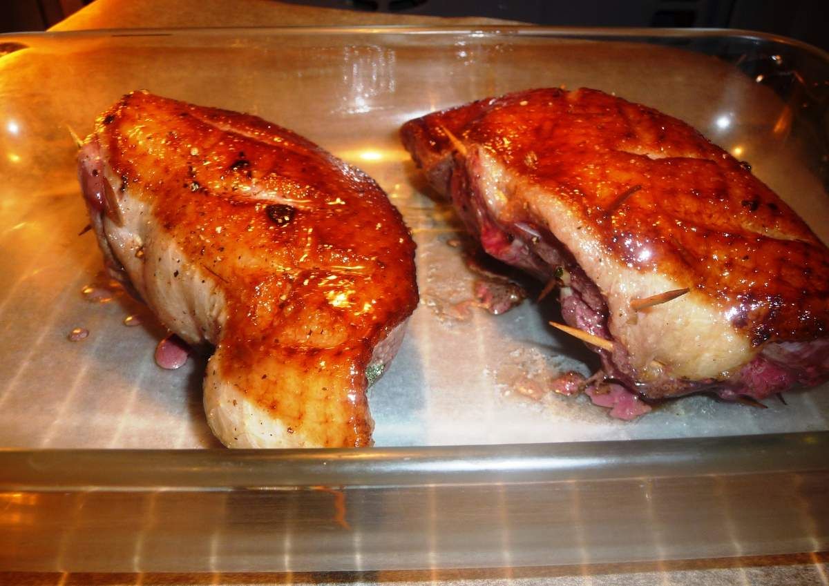 12) Sortir les magrets du four, les laisser reposer 5 minutes en couvrant le plat de papier d'aluminium. Retirer les cure-dent. Couper délicatement des tranches en biais. Regardez comme la cuisson est belle, rosée et tendre et comme cela en "jette" avec cette jolie farce: