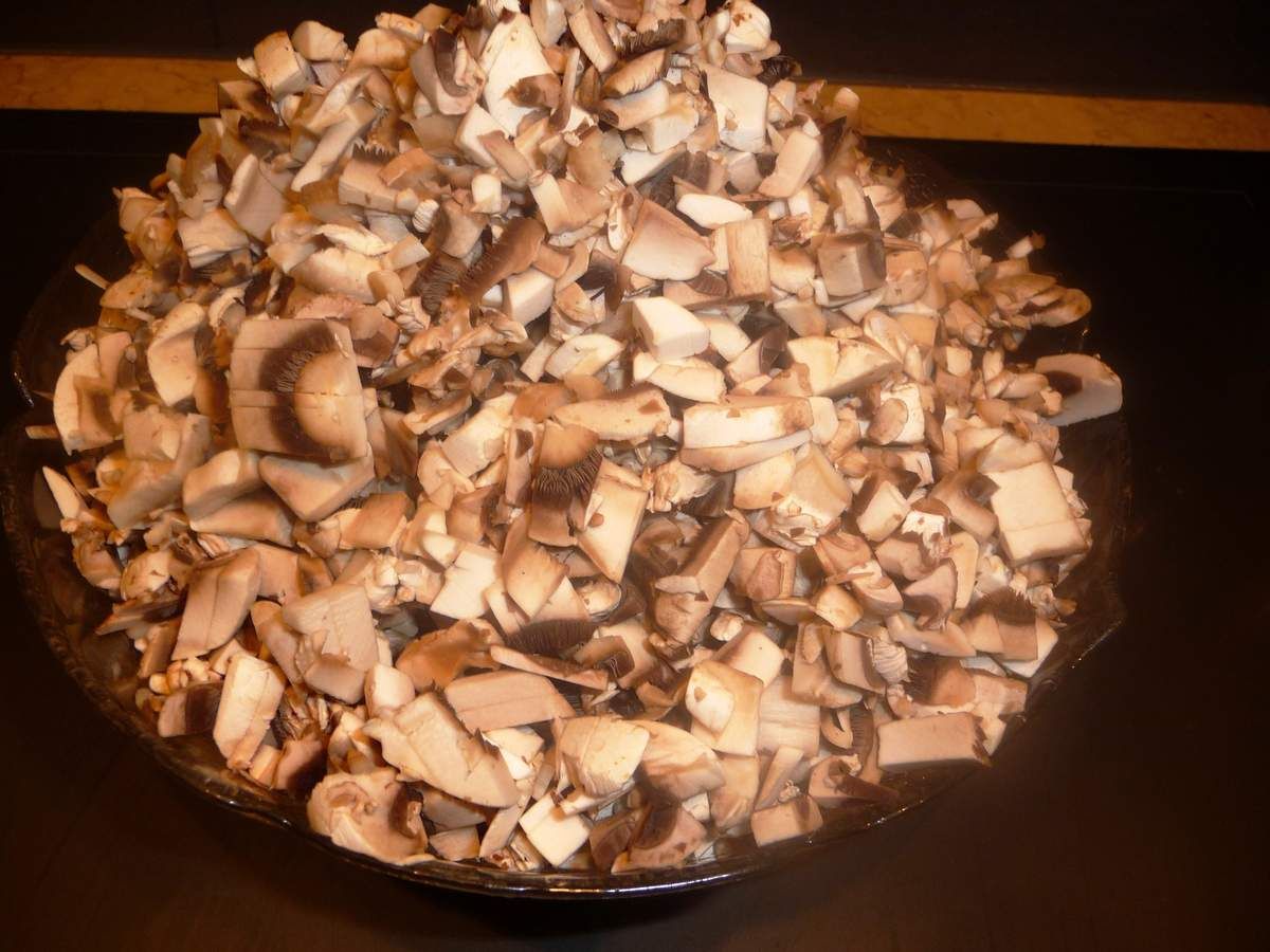 1) Préparer les champignons: les essuyer pour enlever la terre avec du papier ménage. Couper une partie du pied. Les couper en deux dans la longueur, puis plusieurs fois dans la longueur et dans la largeur afin d'obtenir des petits carrés. Arroser d'une bonne càs de jus de citron et mélanger. C'est la phase de la recette qui prend le plus de temps, mais mettez-vous à plusieurs (seule j'ai mis 30 minutes).