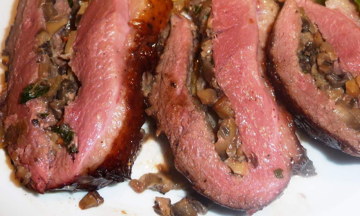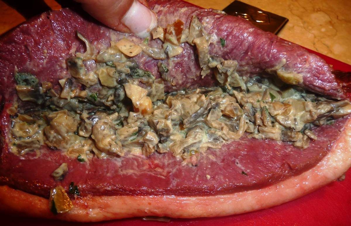 6) Farcir l'intérieur avec la duxelles (attention à ne pas en mettre trop, sinon vous ne pourrez plus les refermer convenablement). Laisser le reste de la duxelles dans la poêle pour la sauce.