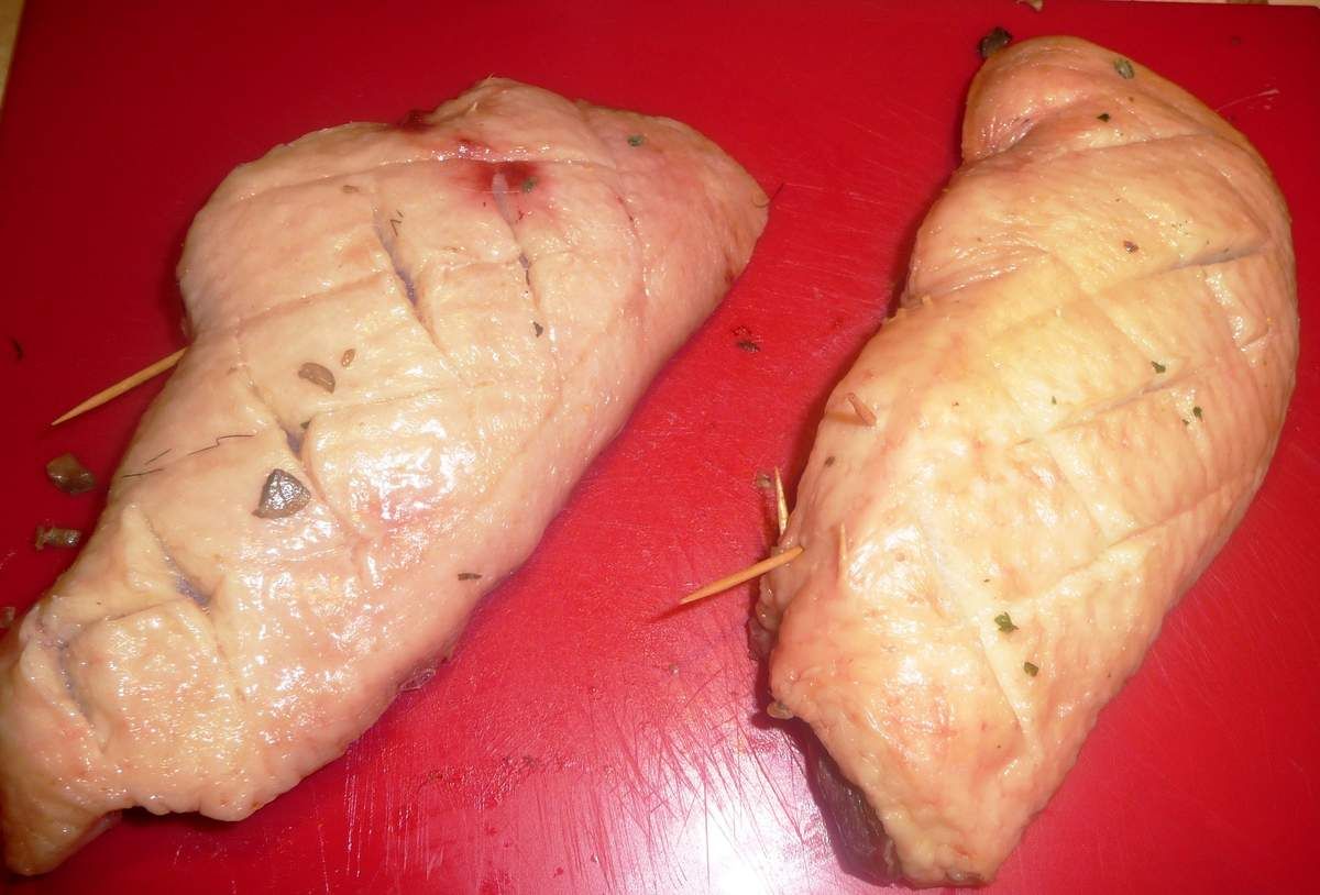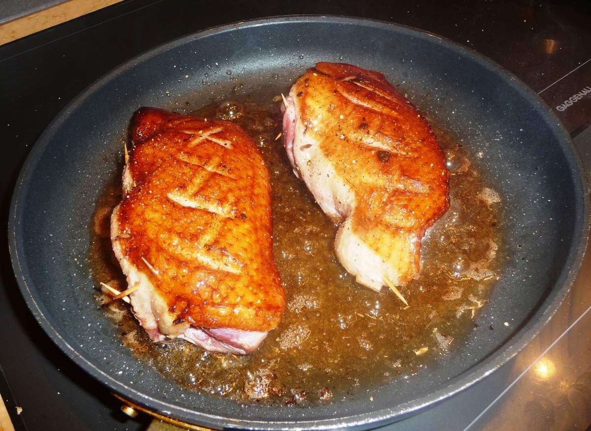 9) Dans une poêle sans matière grasse, saisir d'abord 3 minutes les magrets sur feu vif sur la peau. Puis les retourner et saisir encore 3 minutes du côté chair.
