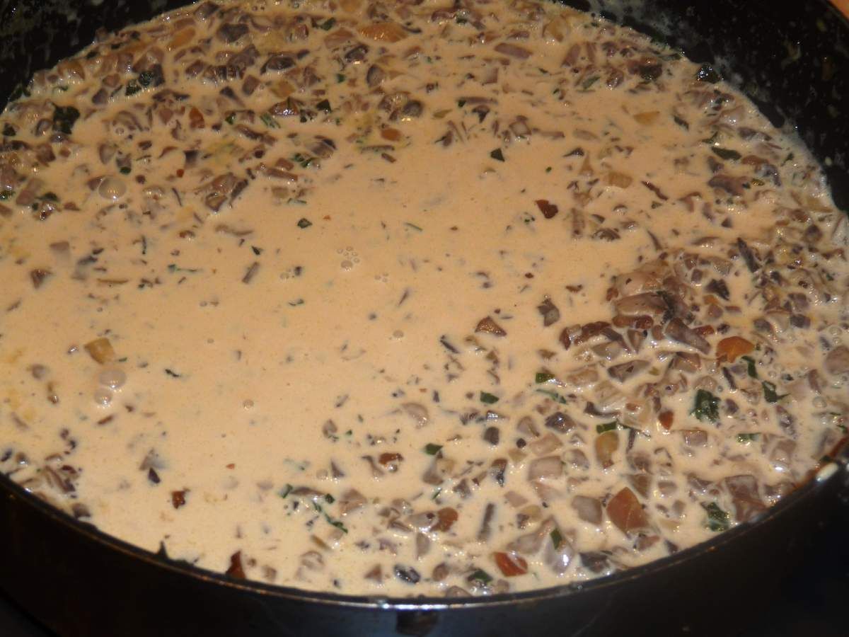 11) Pendant ce temps, ajouter la crème dans la poêle où votre mélange aux champignons et châtaignes vous attend impatiemment. Laisser cuire à feu doux quelques minutes et maintenir au chaud sur feu très doux. Goûter et ajouter éventuellement un peu de sel.