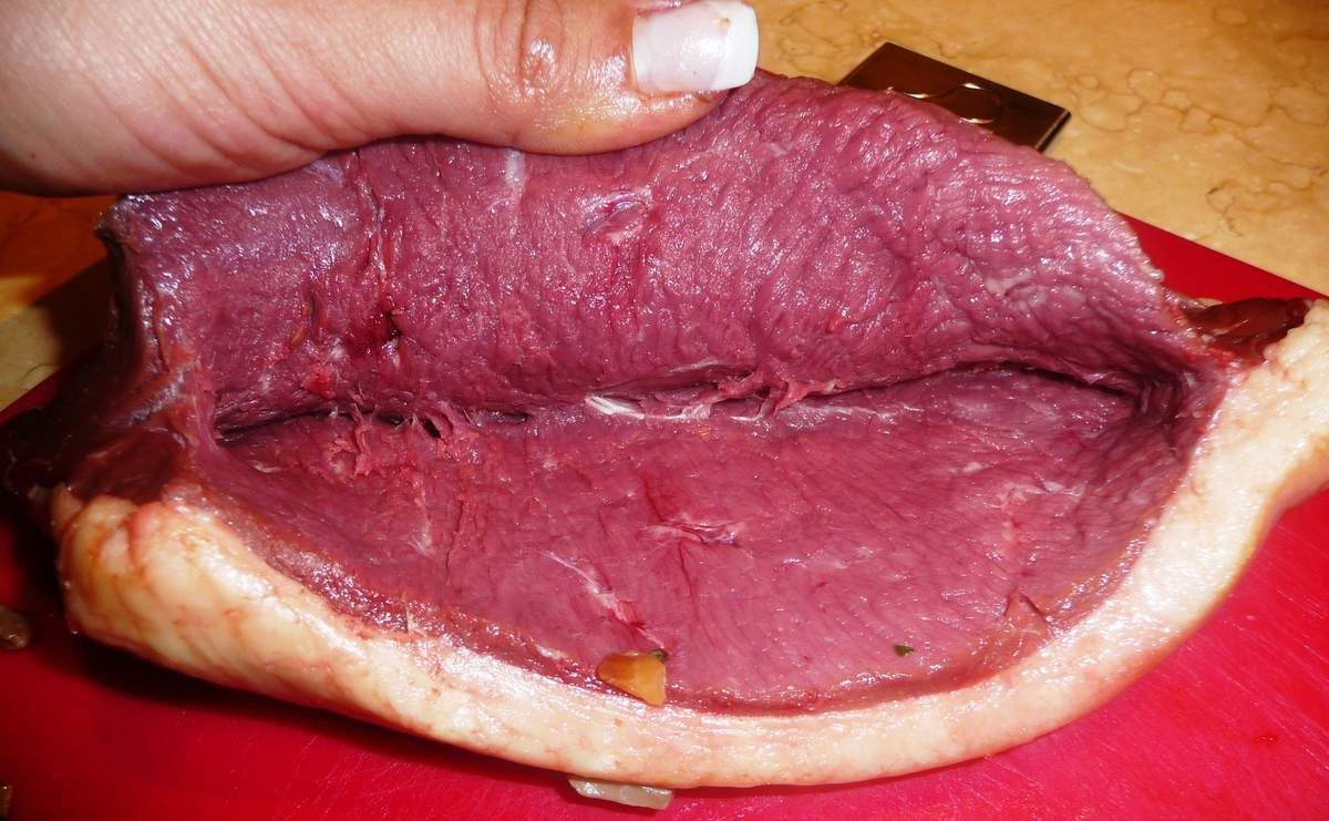 5) Occupons-nous des magrets: Préchauffer le four à 90°C, y glisser un plat allant au four. Saler et poivrer les magrets des deux côtés. Faire une entaille large avec un couteau bien aiguisé sur la longueur, attention à ne pas transpercer l'autre côté, comme ça: