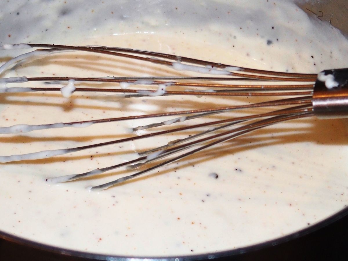 8) Pendant ce temps, préparer la béchamel. Fondre les 50g de beurre dans une casserole. Quand le beurre a fondu, ajouter les 50g de farine et bien mélanger une minute avec une spatule. Hors du feu, ajouter le lait et la crème en fouettant vigoureusement. Râper une bonne dose de noix de muscade (ou de la muscade moulue), saler, poivrer, goûter. Remettre sur feu moyen 5 minutes et ajouter le parmesan en remuant régulièrement, le temps que la béchamel épaississe. Laisser tiédir.