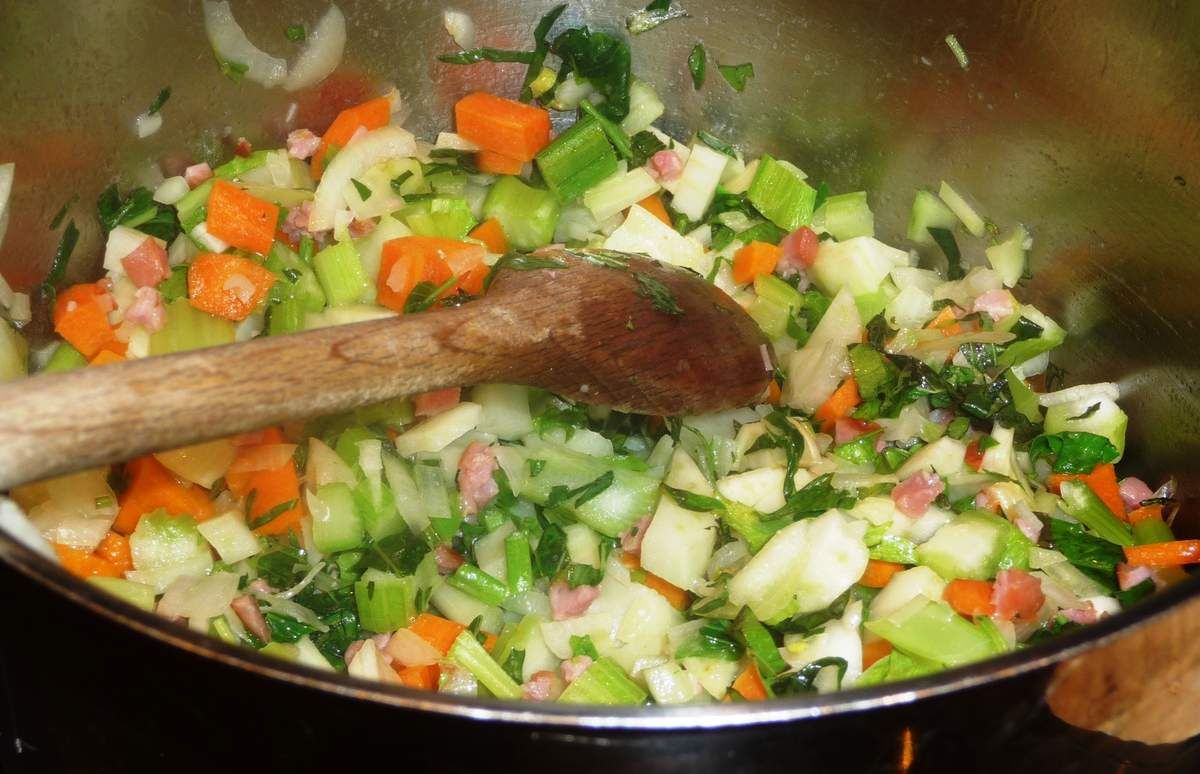 3) Dans une casserole, déposer un filet d'huile d'olive, chauffer et faire revenir l'ail et l'oignon 2 minutes. Ajouter les légumes coupés au point 2 ainsi que les lardons. Faire revenir environ 15 minutes à couvert en mélangeant souvent. Ciseler le basilic et ajouter. Poivrer et saler un peu.