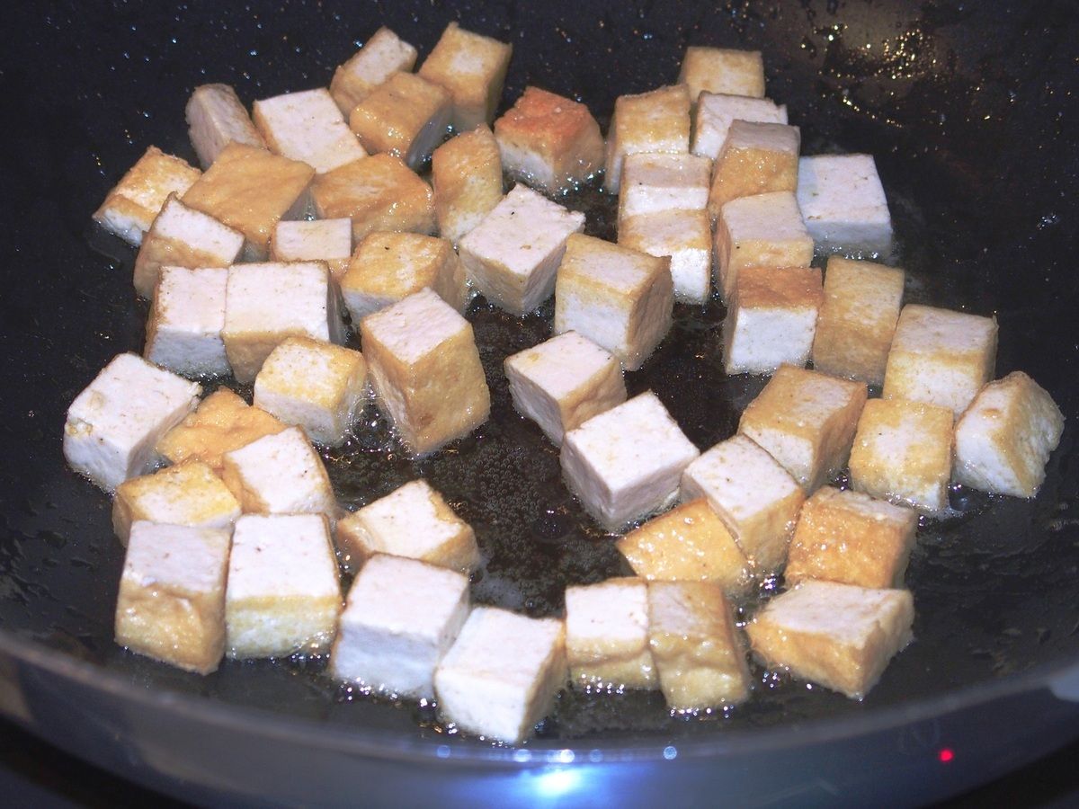 8) Dans une grande poêle ou un wok, mettre à chauffer un peu d'huile. Sur feu moyen-vif, faire revenir les dés de tofu 4 minutes pour les dorer en mélangeant souvent.