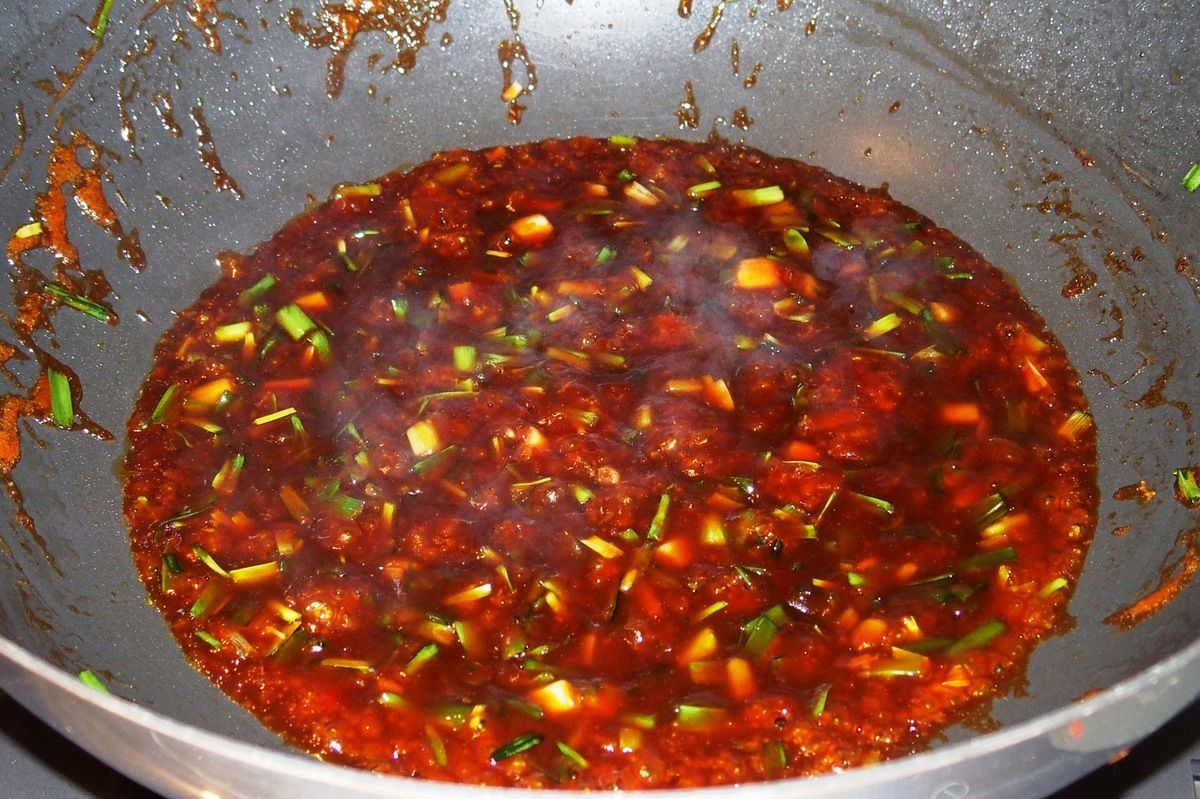 9) Ajouter les crevettes et cuire encore 3 minutes en mélangeant jusqu'à ce qu'elles soient roses. Ajouter 2 càs de sauce soja. Mélanger. Réserver le tout dans un récipient.