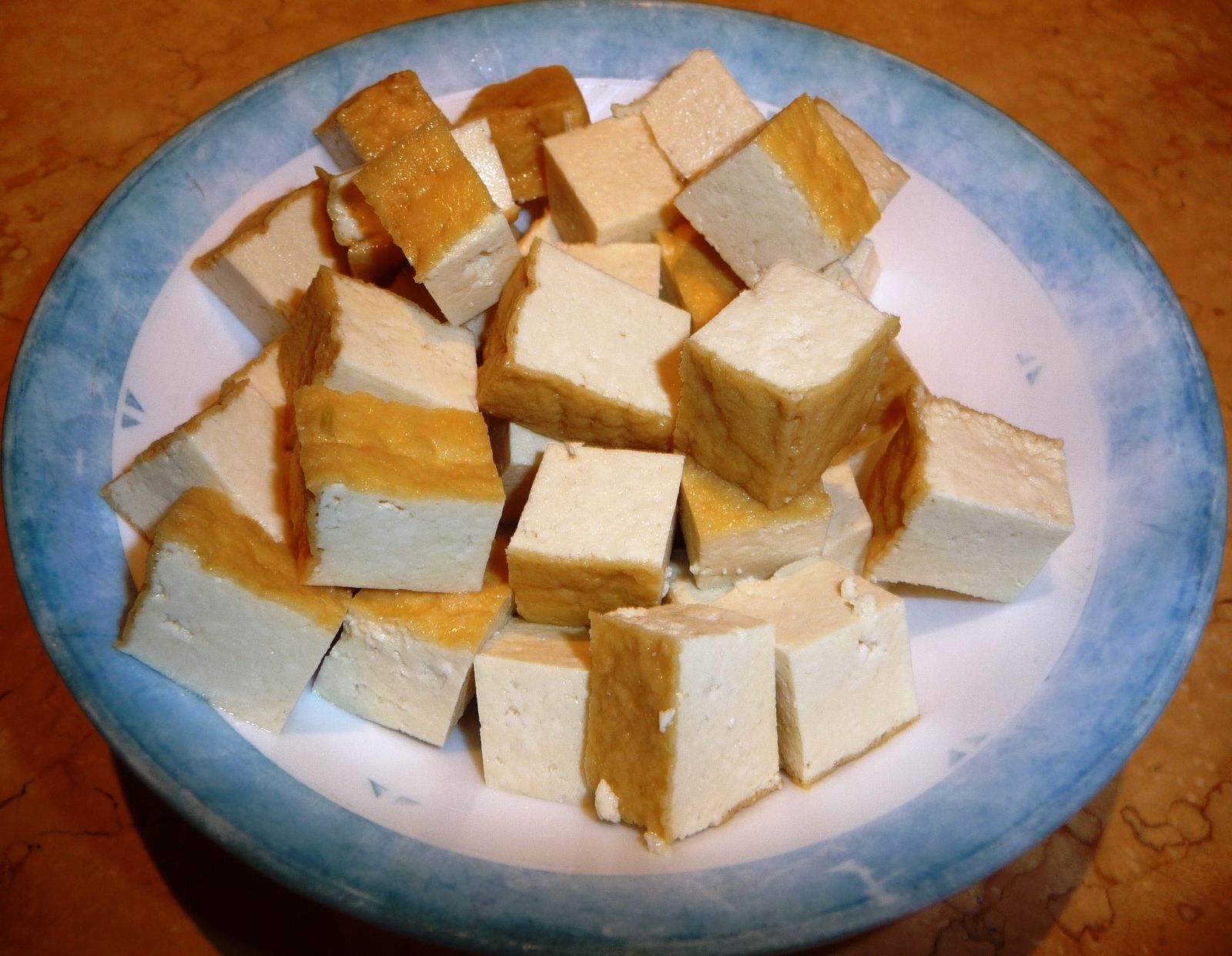 4) Couper le tofu en carrés. Réserver dans un bol.