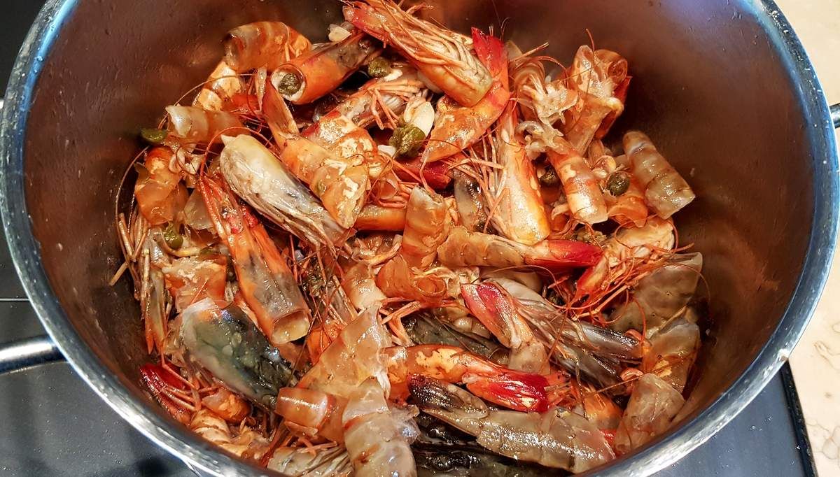 4) Dans une poêle, mettre à chauffer un bon filet d'huile d'olive. Baisser le feu sur feu doux et ajouter anchois, câpres et ail. Cuire ainsi 2 minutes en mélangeant. Ajouter les carapaces des crevettes et faire revenir 3 minutes en montant le feu sur feu moyen. Parallèlement, faire bouillir 5 dl d'eau avec le fumet de poisson dans une petite casserole.