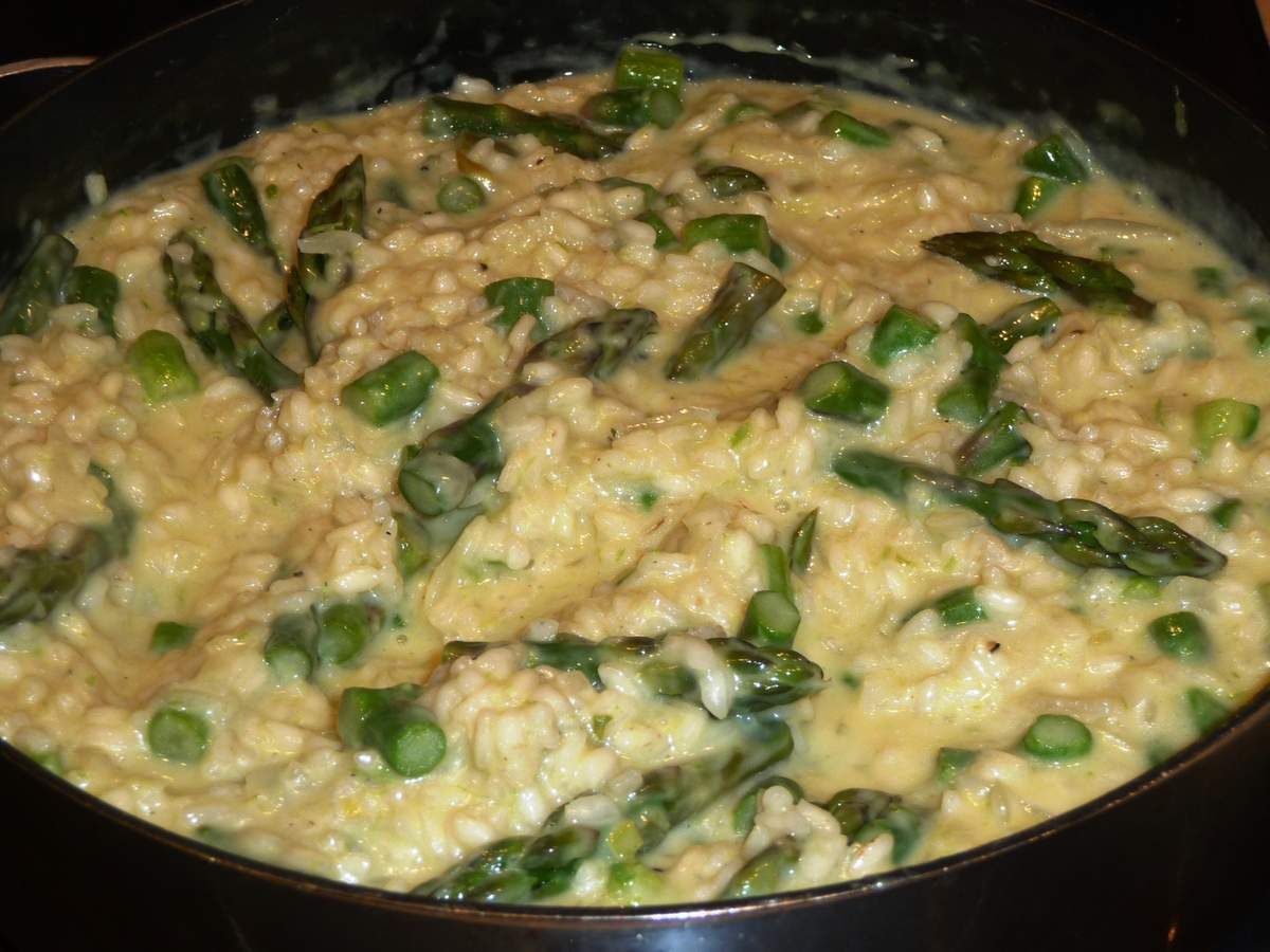 9) Quand le riz est cuit, ajouter les rondelles d'asperges et le mélange queues d'asperges-mascarpone. Mélanger. Ajouter le parmesan. Mélanger et cuire encore 2 minutes. Goûter et saler si nécessaire. Ajouter les têtes d'asperges. Mélanger délicatement. Le risotto ne doit pas être sec, il doit rester encore un peu liquide, c'est important. Arrêter le feu et couvrir. Laisser reposer le risotto 2 minutes.
