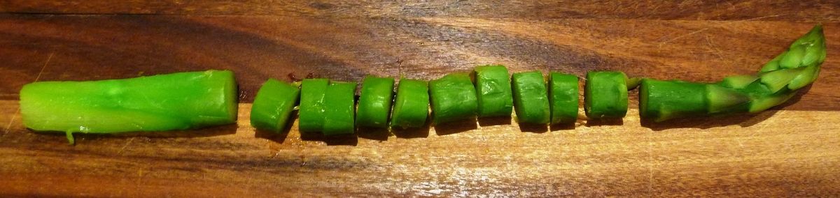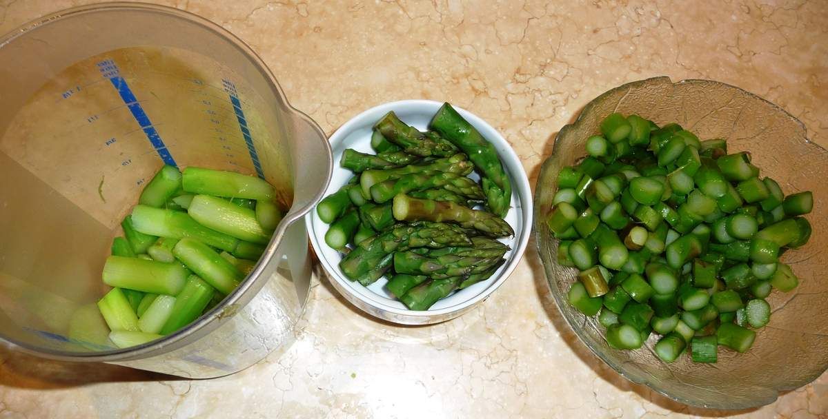 3) Lorsque les asperges sont tièdes, les couper ainsi: les têtes, le milieu en rondelles et la queue. Mettre chaque partie à part dans des récipients, les queues dans un récipient haut, les rondelles dans un bol et les têtes dans un autre bol.