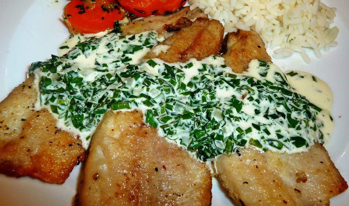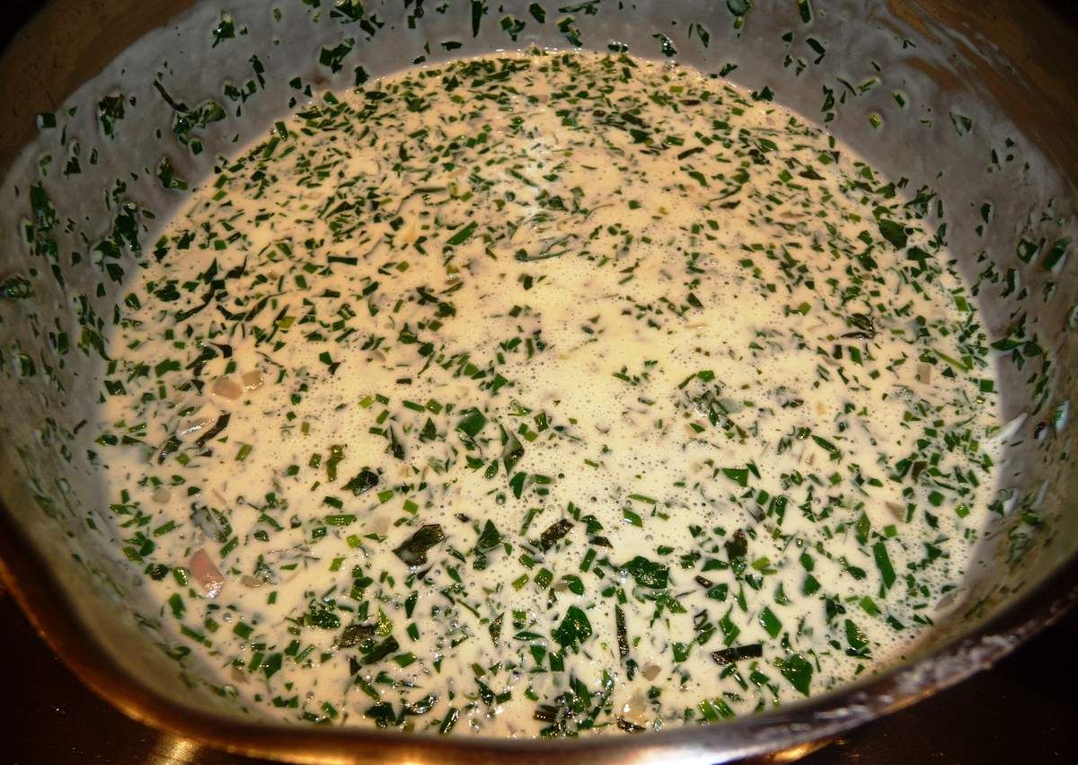 Des échalotes, du persil, ciboulette et basilic. Du beurre, du vin blanc, un filet de jus de citron et de la crème. Un délice.