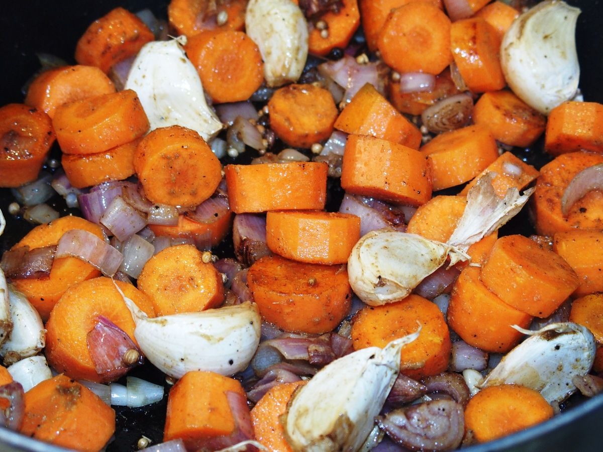 3) Retirer les souris et les réserver. Dans la même cocotte, faire revenir carottes, échalotes, les gousses d'ail avec la peau. Ajouter les grains de poivre, le cumin, les graines de coriandre. Faire revenir en mélangeant souvent sur feu moyen-doux 5 minutes.