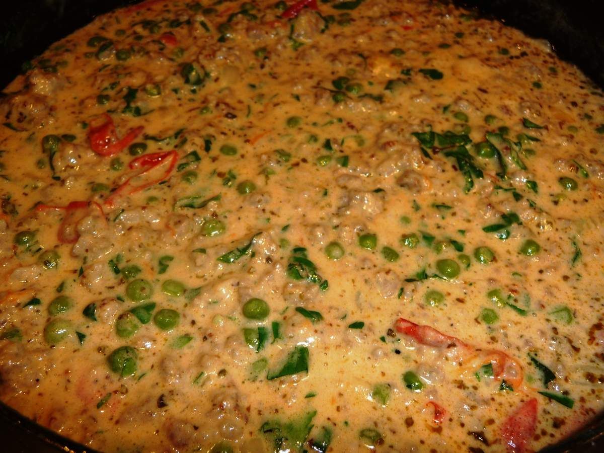Cette recette c'est donc: une saucisse déstructurée, des petits pois, des tomates cerise, et une délicieuse sauce crémeuse.
