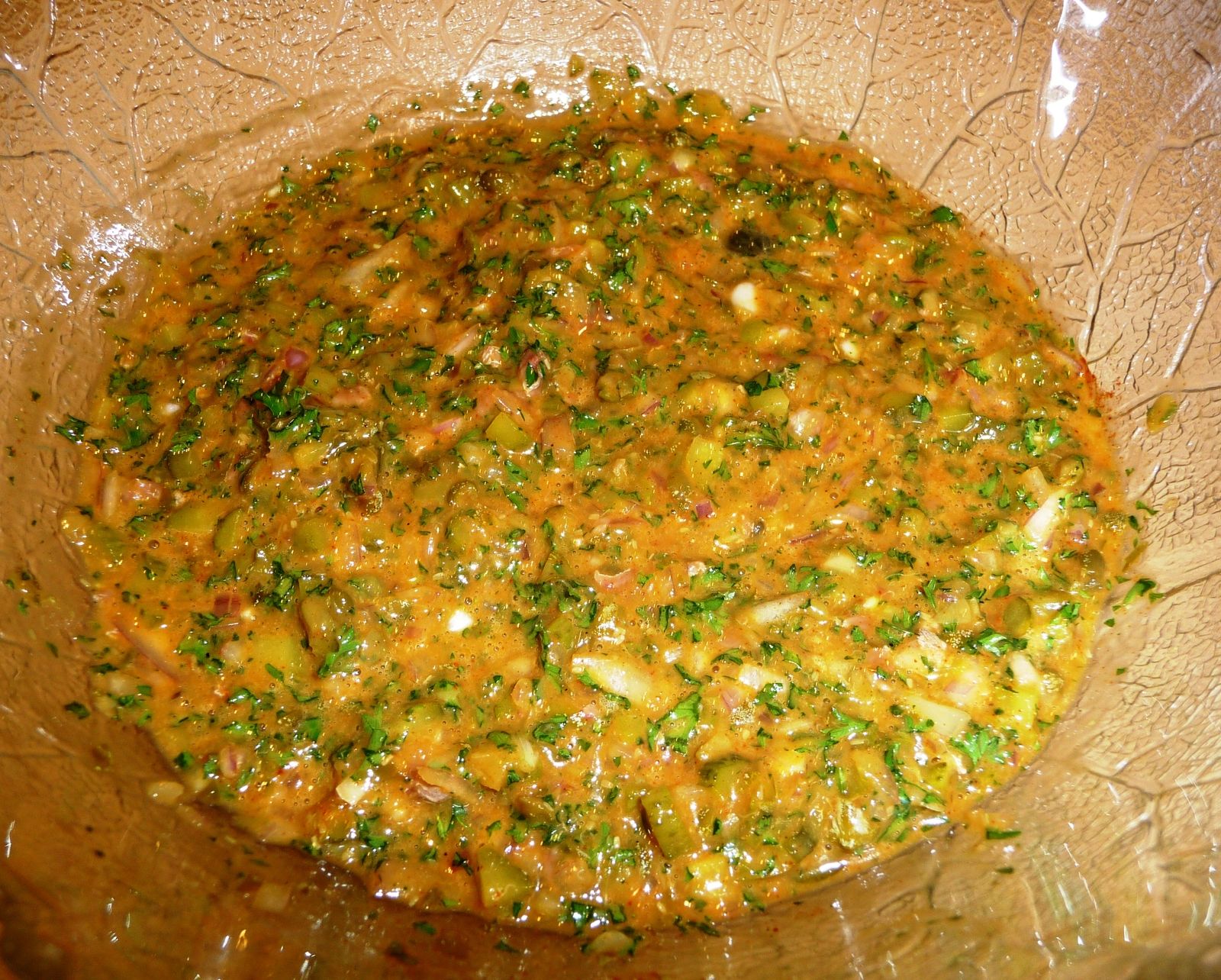 1) Hacher finement les câpres et les mettre dans un grand récipient. Ajouter la moutarde et une petite càs (une giclée quoi...) d'huile. Bien écraser avec une fourchette