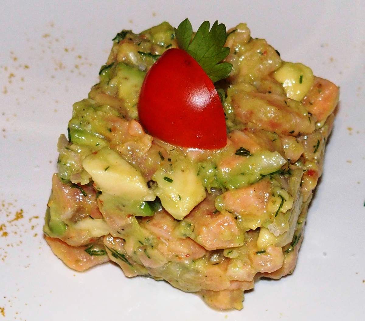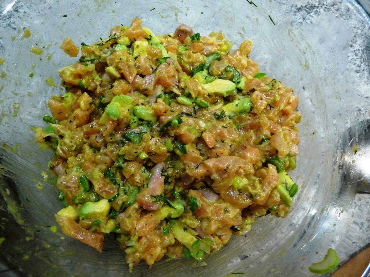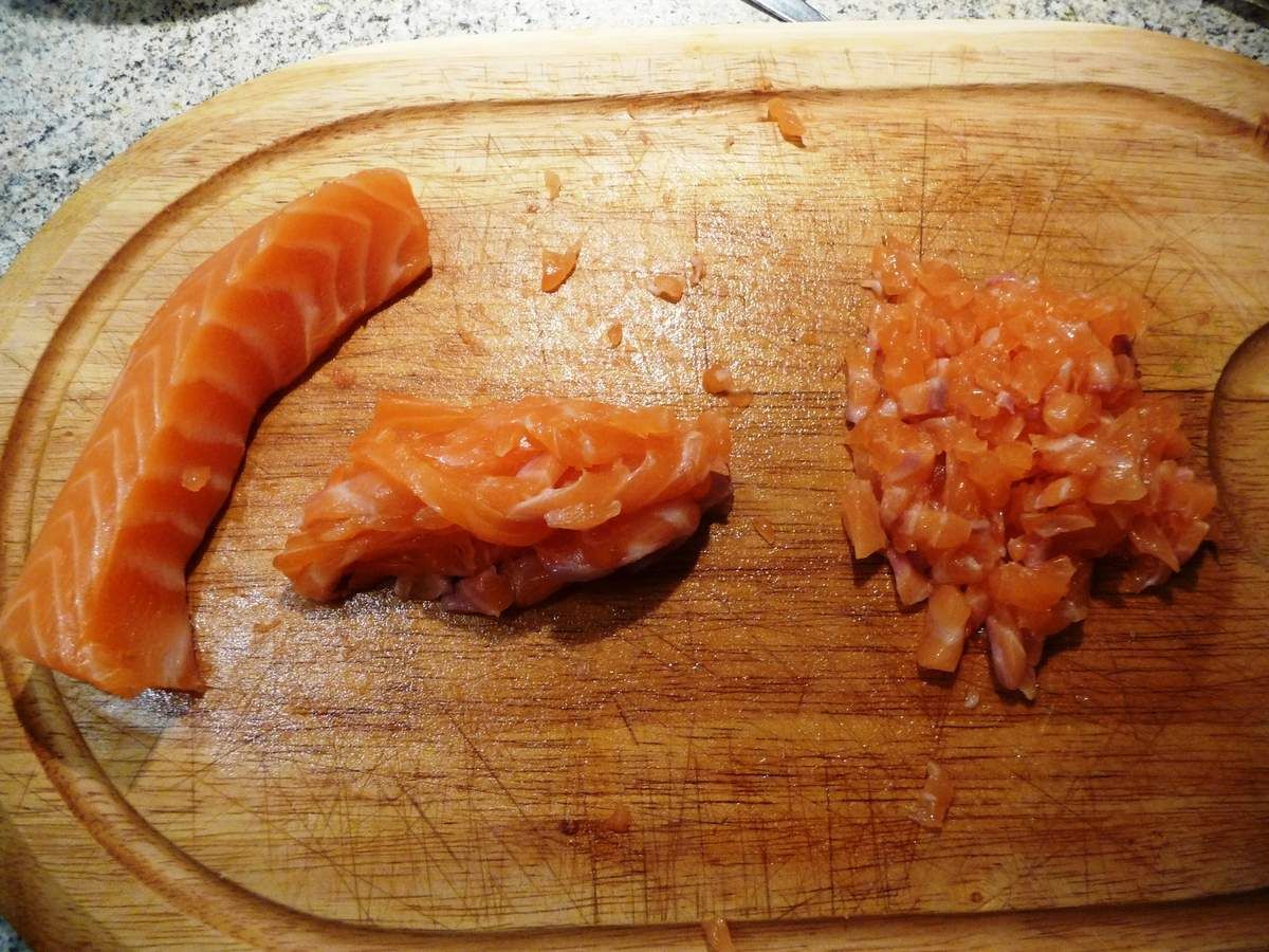 3) Détailler le saumon en tartare (tous petits dés) et mélanger à l'avocat (Le couper d'abord en lanières puis en dés, voir photo ci-dessous).