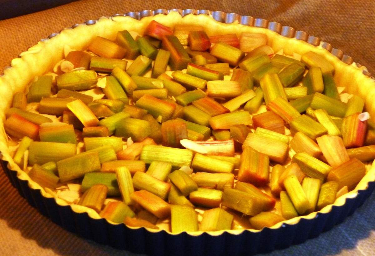 2) Préchauffer le four à 200°C. Foncer un moule à tarte en le beurrant et farinant. Y déposer la pâte et piquer le fond avec une fourchette. Ajouter sur le fond les amandes effilées, puis les tronçons de rhubarbe. Enfourner pour 20 minutes au milieu du four.