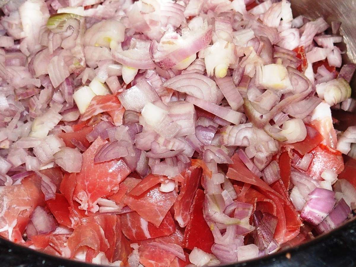 2) Couper le jambon cru en petits dés et hacher finement les échalotes. Mettre ces deux ingrédients dans un récipient.