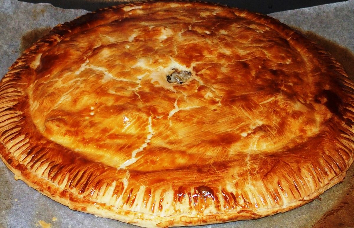 10) Recouvrir de la deuxième abaisse de pâte et sceller le bord en pressant avec les doigts puis avec une fourchette sur tout le tour. Piquer un peu de part et d'autres avec la fourchette et faire une incision au centre avec un couteau pour que l'humidité s'évapore en cours de cuisson. Vous pouvez confectionner une cheminée en roulant une petite bande d'aluminium autour de l'auriculaire et en la plantant dans l'orifice. Badigeonner l'ensemble de jaune d'oeuf.