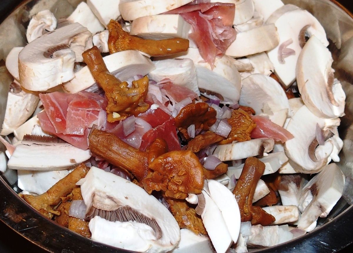 3) Couper les champignons en lamelles (champignons de Paris) ou couper les plus grosses chanterelles en 2. Pour les champignons frais, si besoin, les gratter un peu avec un couteau pour enlever la terre, mais ne pas les laver car ils se gorgeraient d'eau et perdraient leur saveur. Mettre les champignons dans le récipient échalotes-jambon cru.